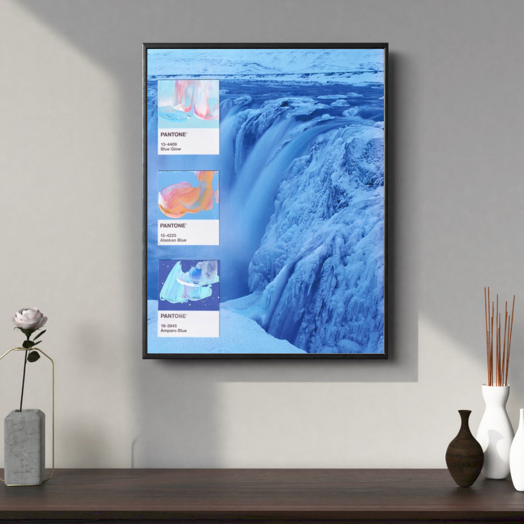 Von der Story an die Wand: Am Anfang meiner Instagram-Reise habe ich mit Landschaftsfotos gearbeitet und meine gemalten Pantone-Karten darübergelegt, fast wie auf einem digitalen Moodboard. Was damals in meinen Stories begann, wird jetzt greifbar: Collagen, in denen Natur und Farbe eins werden.