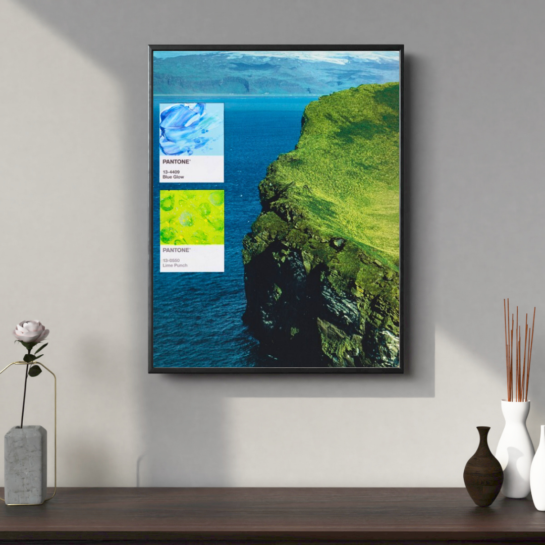 Von der Story an die Wand: Am Anfang meiner Instagram-Reise habe ich mit Landschaftsfotos gearbeitet und meine gemalten Pantone-Karten darübergelegt, fast wie auf einem digitalen Moodboard. Was damals in meinen Stories begann, wird jetzt greifbar: Collagen, in denen Natur und Farbe eins werden.
