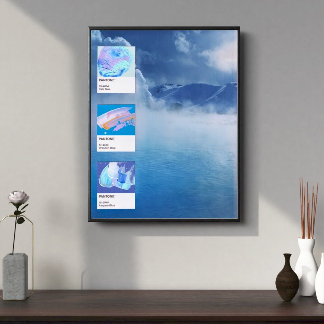 Von der Story an die Wand: Am Anfang meiner Instagram-Reise habe ich mit Landschaftsfotos gearbeitet und meine gemalten Pantone-Karten darübergelegt, fast wie auf einem digitalen Moodboard. Was damals in meinen Stories begann, wird jetzt greifbar: Collagen, in denen Natur und Farbe eins werden.