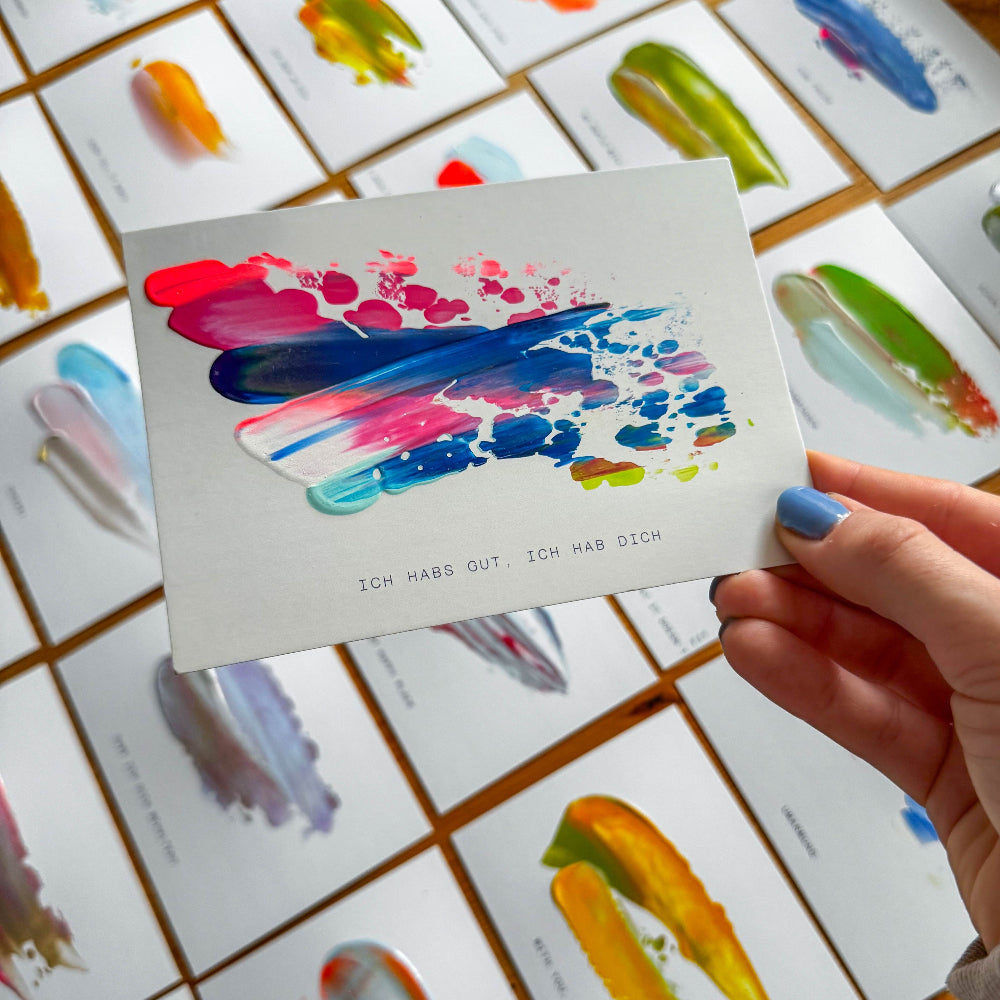 Diese handbemalten Karten sind mehr als nur Papeterie – sie sind kleine Kunstwerke, jedes ein Unikat. Mit viel Liebe und Kreativität gestaltet, tragen die Karten inspirierende Worte, die einem bestimmten Oberthema gewidmet sind – perfekt, um eine Botschaft von Herzen zu übermitteln.